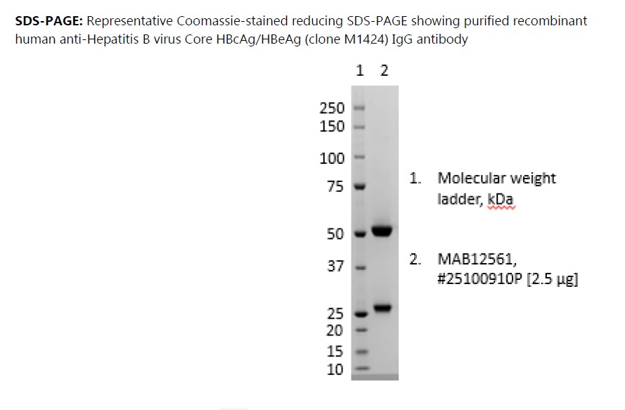 Recombinant human anti-Hepatitis B virus Core HBcAg/HBeAg (clone M1424) IgG antibody, purified by protein G affinity chromatography and dialysis.