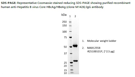 Recombinant human anti-Hepatitis B virus Core HBcAg/HBeAg (clone M1426) IgG antibody, purified by protein G affinity chromatography and dialysis.