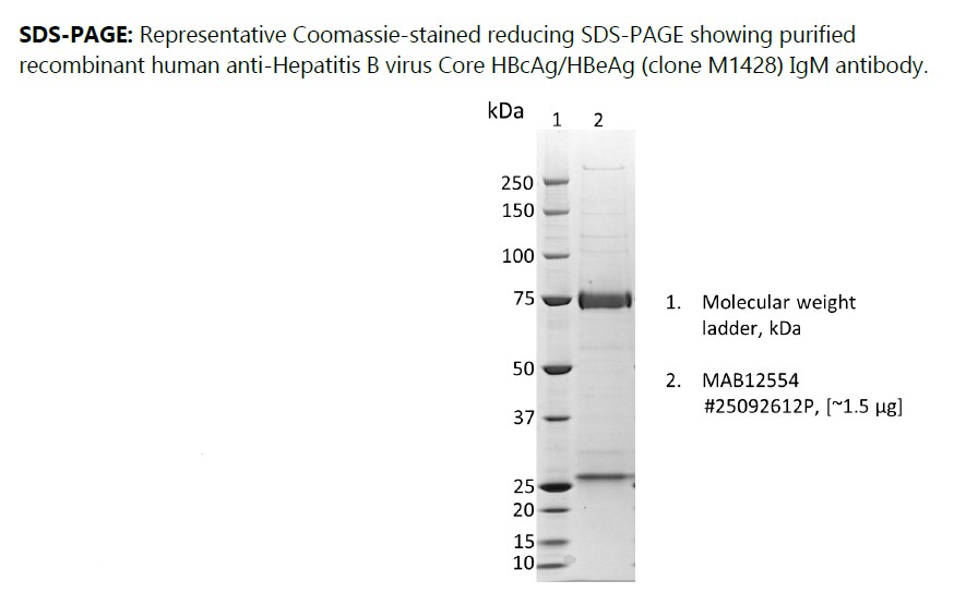 Recombinant human anti-Hepatitis B virus Core HBcAg/HBeAg (clone M1428) IgM antibody, produced in HEK293 cells and purified by ion exchange chromatography, ammonium sulphate precipitation and dialysis.