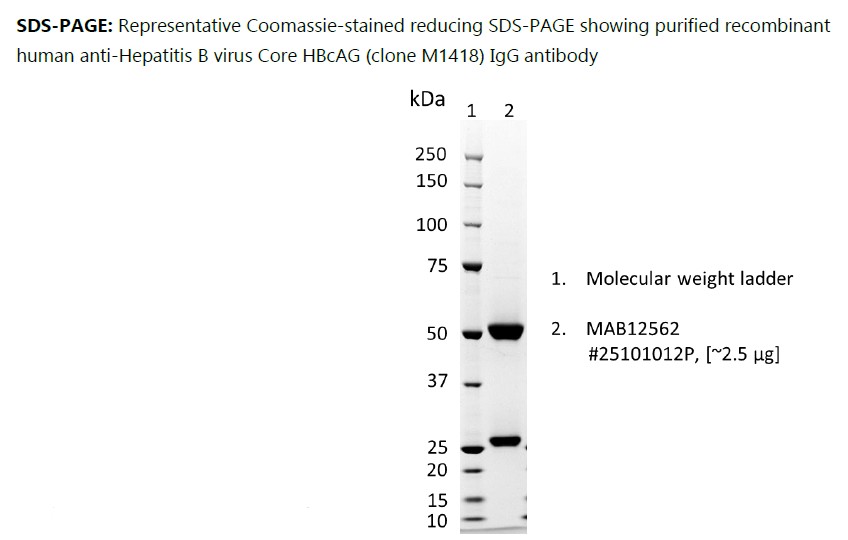 Recombinant human anti-Hepatitis B virus Core HBcAG (clone M1418) IgG antibody, purified by Protein G affinity chromatography and dialysis.
