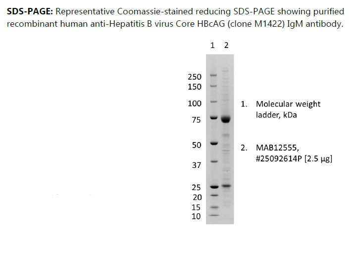 Recombinant human anti-Hepatitis B virus Core HBcAG (clone M1422) IgM antibody, produced in HEK293 cells and purified by ion exchange chromatography and dialysis.