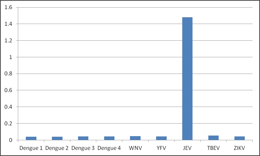 ELISA assay showing specificity of MAB12174 for Japanese Encephalitis Virus NS1 protein. NS1 antigens from different flaviviruses were coated on an ELISA plate at 0.5ug/ml, and detected with MAB12174 at 0.01ug/ml, visualized with Goat anti-mouse IgG:HRP.