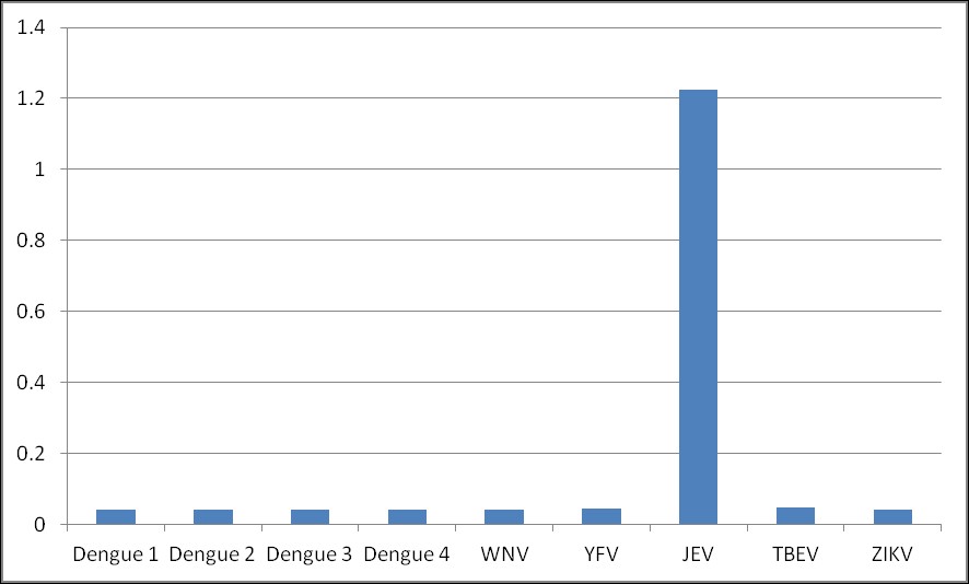 ELISA assay showing specificity of MAB12176 for Japanese Encephalitis Virus NS1 protein. NS1 antigens from different flaviviruses were coated on an ELISA plate at 0.5ug/ml, and detected with MAB12176 at 0.01ug/ml, visualized with Goat anti-mouse IgG:HRP.