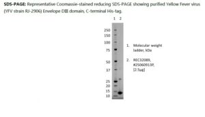 Recombinant Yellow Fever virus (YFV) DIII domain of the Envelope protein. The protein was produced in E. Coli and purified from cell pellet by immobilized metal affinity and ion exchange chromatography.