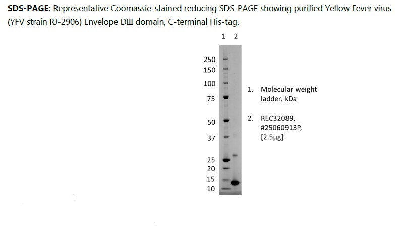Recombinant Yellow Fever virus (YFV) DIII domain of the Envelope protein. The protein was produced in E. Coli and purified from cell pellet by immobilized metal affinity and ion exchange chromatography